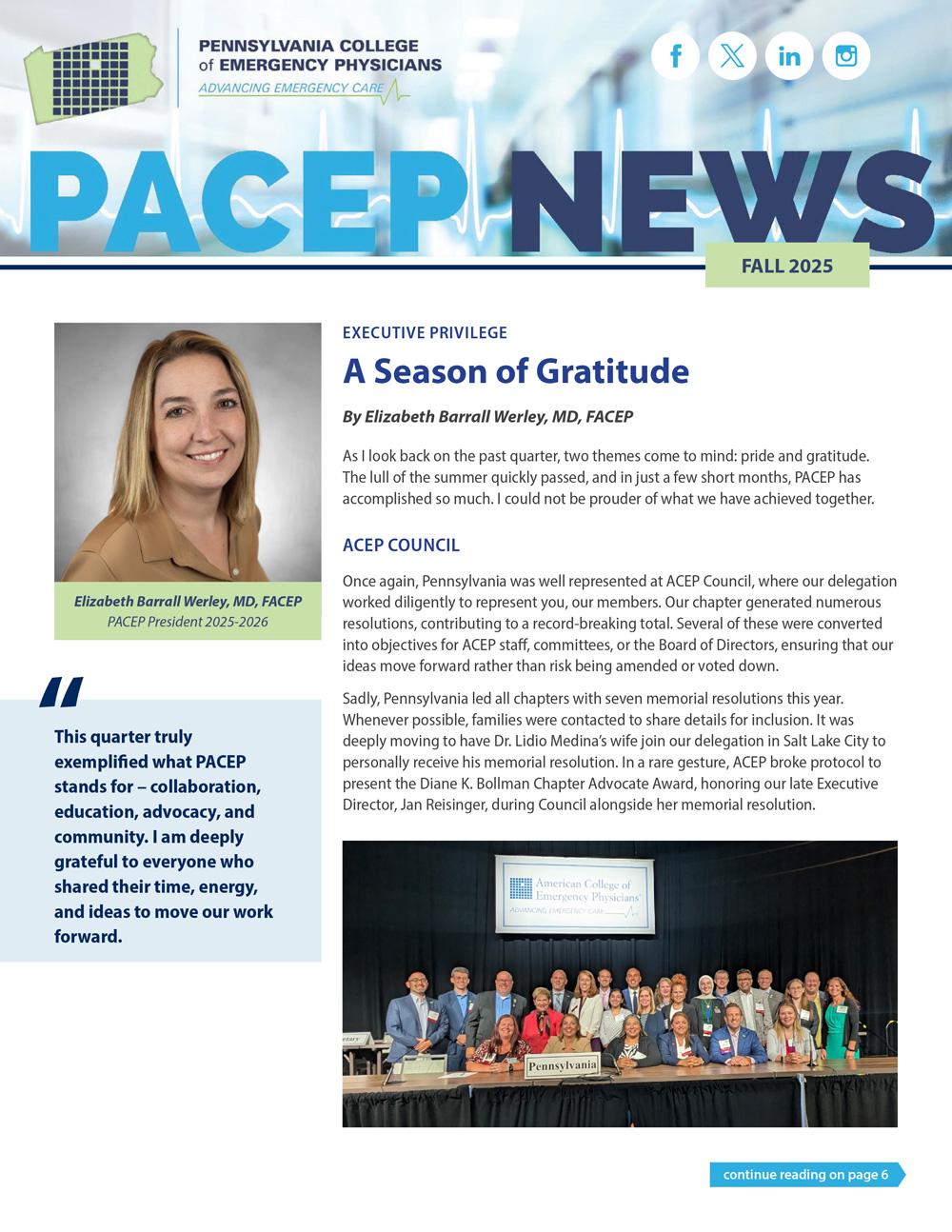 is the official publication of the Pennsylvania College of Emergency Physicians. Published four times a year and e-mailed, this publication provides news and commentary on issues of interest to more than 2,000 physician members.