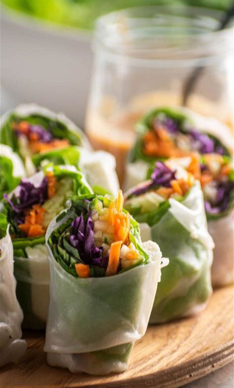 Spring Rolls: 1. Submerge one piece of rice paper into water for 15-20 seconds. Remove and place on a damp cloth. Place the tofu in the center of the paper. 2. Layer on the vegetables and herbs. Make sure not to overfill the spring roll or it will break as you are rolling it. 3. Carefully fold over one end and then fold over the sides. Then roll over carefully to close the spring roll. Normally there are directions on the rice paper package for rolling. 4. Serve the spring rolls with the peanut sauce.